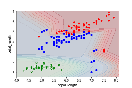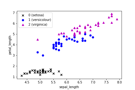 2次元以上になると、データの可視化が困難なので、とりあえず入力をsepal_lengthとpetal_lengthの2つにしておく。